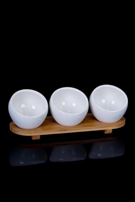 ACAR PURE Plateau apéritif en bambou avec 3 bols en porcelaine blanche