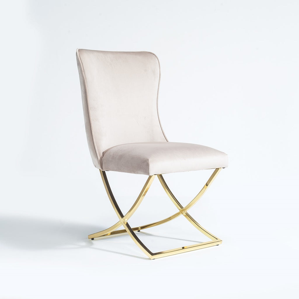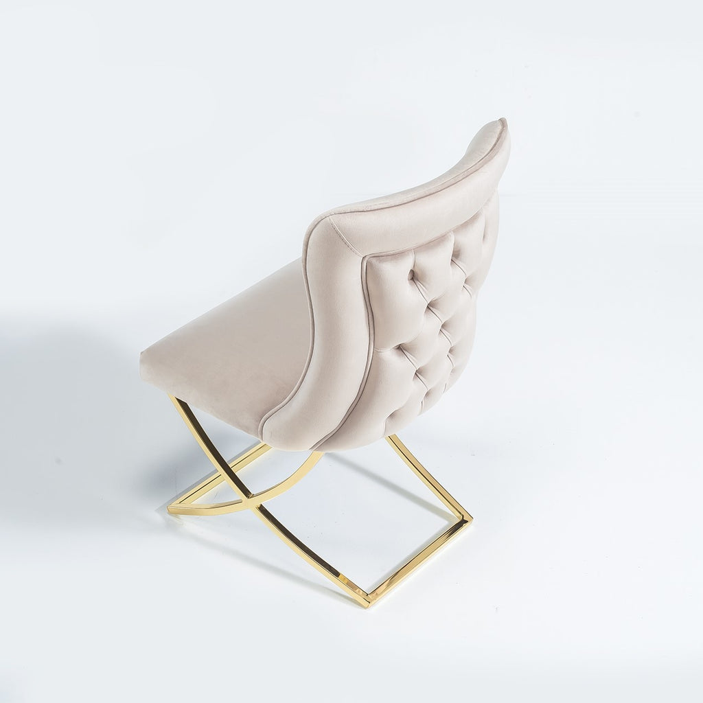Chaise design moderne dossier capitonné en velours couleur crème avec piètement en acier inoxydable collection Scarlette avec un confort parfait