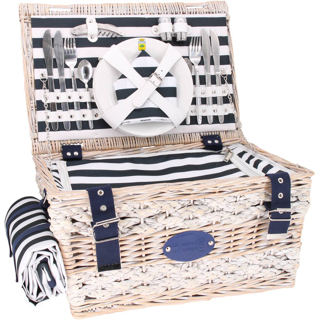 Il est également élégant à l’intérieur avec son tissu bleu à rayures blanches et ses sangles de couleur blanche. Grâce à ces différentes touches et son mélange de couverts en acier inoxydable et assiettes en céramique monogrammées, cet ensemble en fait un panier tendance, chic et raffiné.