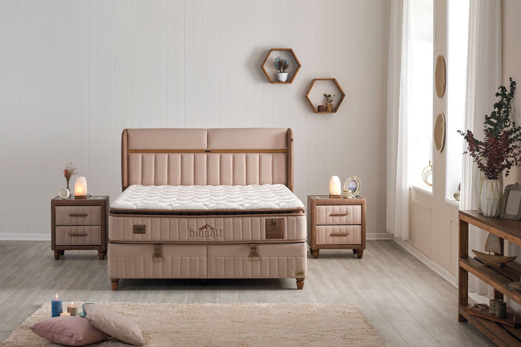 Le lit Biosalt, développé par Bambi Bed à partir de sel gemme naturel extrait de la grotte de sel de Çankırı, dont l'histoire connue remonte à au moins 5 000 ans, soutient l'établissement du biorythme en éliminant l'électricité statique du corps et améliore ainsi les habitudes et la qualité du sommeil. Le sel, qui contient de manière équilibrée 84 des 92 éléments nécessaires au corps humain, vous aide à respirer plus facilement en neutralisant les ions positifs émis par les appareils électroniques grâce aux ions négatifs qu'il émet dans l'environnement. Scientifiquement prouvé comme étant plus pur que le sel de l'Himalaya et ayant des effets miraculeux sur la santé grâce à sa caractéristique enrichie en minéraux naturels, le sel gemme naturel de Çankırı apporte l'effet de salle de sel à votre chambre avec Bambi Biosalt.