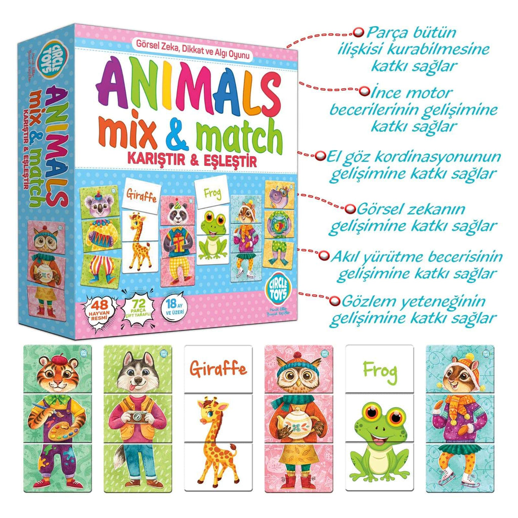 Le jeu "Mix & Match , Les Animaux" est un jeu très amusant. Sur la face avant des cartes, 24 images  d'animaux, chacune divisée  en  3 parties. Le but principal du  jeu est de découvrir à quel animal appartiennent la tête, le tronc et les pieds .