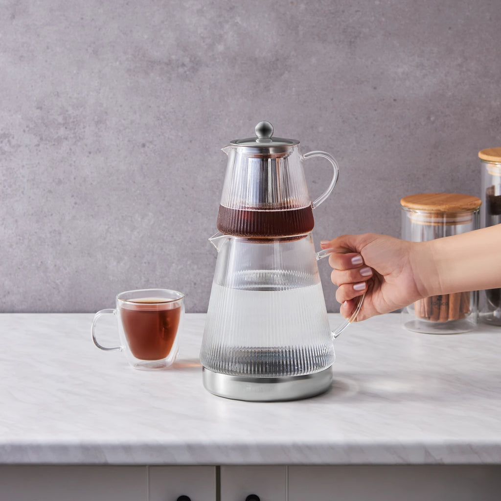 La théière Keops a été conçue en verre borosilicaté spécial résistant à la chaleur. La théière supérieure avec filtre en acier inoxydable, peut être chaufée seule pour infuser une tisane. Facile à nettoyer et compatible au lave-vaisselle. Elle est adaptée pour une utilisation à toutes les plaques y compris induction .