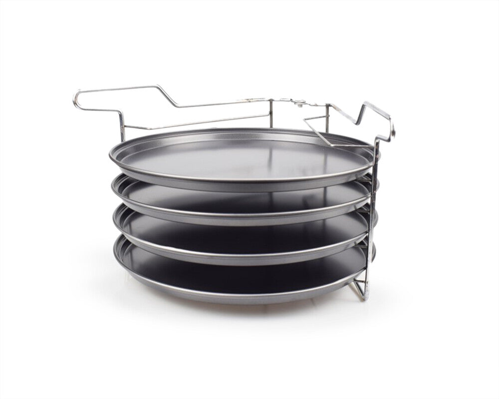 Avec notre kit de cuisson pour pizza, vous pouvez préparer quatre pizzas rondes d'un seul coup, car elles sont cuites simultanément sur des plaques individuelles empilées les unes sur les autres dans notre support pratique à larges poignées. Un système très agréable à utiliser.