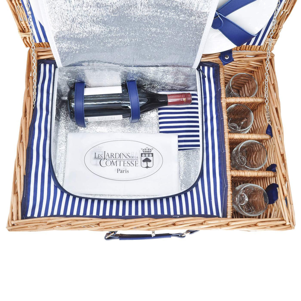 Il contient également tout ce qu'il faut pour un pique-nique de 4 personnes : assiettes en porcelaine de couleur blanche, verres en verre, couverts (fourchettes, couteau et cuillères) et d'autres accessoires bien pratiques pour un pique-nique comme son petit tire-bouchon. Nous avons pensé à tout : vous trouverez aussi dans le panier Fontainebleau, 4 serviettes en tissu, et une pochette pour ranger votre vaisselle sale.