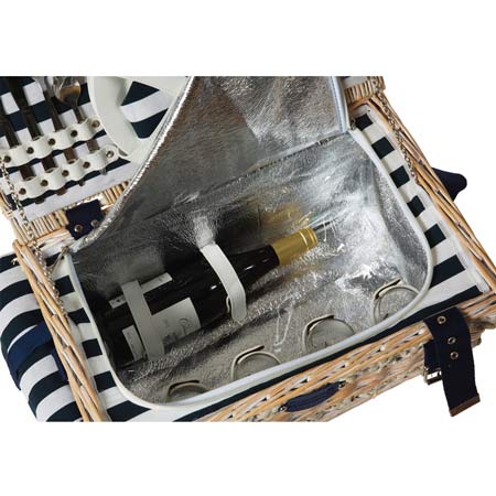 Il est également élégant à l’intérieur avec son tissu bleu à rayures blanches et ses sangles de couleur blanche. Grâce à ces différentes touches et son mélange de couverts en acier inoxydable et assiettes en céramique monogrammées, cet ensemble en fait un panier tendance, chic et raffiné.
