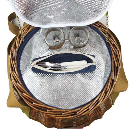 Le panier pique-nique rond 2 personnes possède une grande poche isotherme fermée que l'on peut ouvrir grâce à sa fermeture éclair intégrée. Cette poche est assez large pour y glisser une bouteille de vin ou tout autre boisson. A l’intérieur de cette poche isotherme se trouve 2 attaches pour les verres (à noter que les verres sont vendus avec le panier) afin de déplacer le panier pique-nique sans faire de casse.
