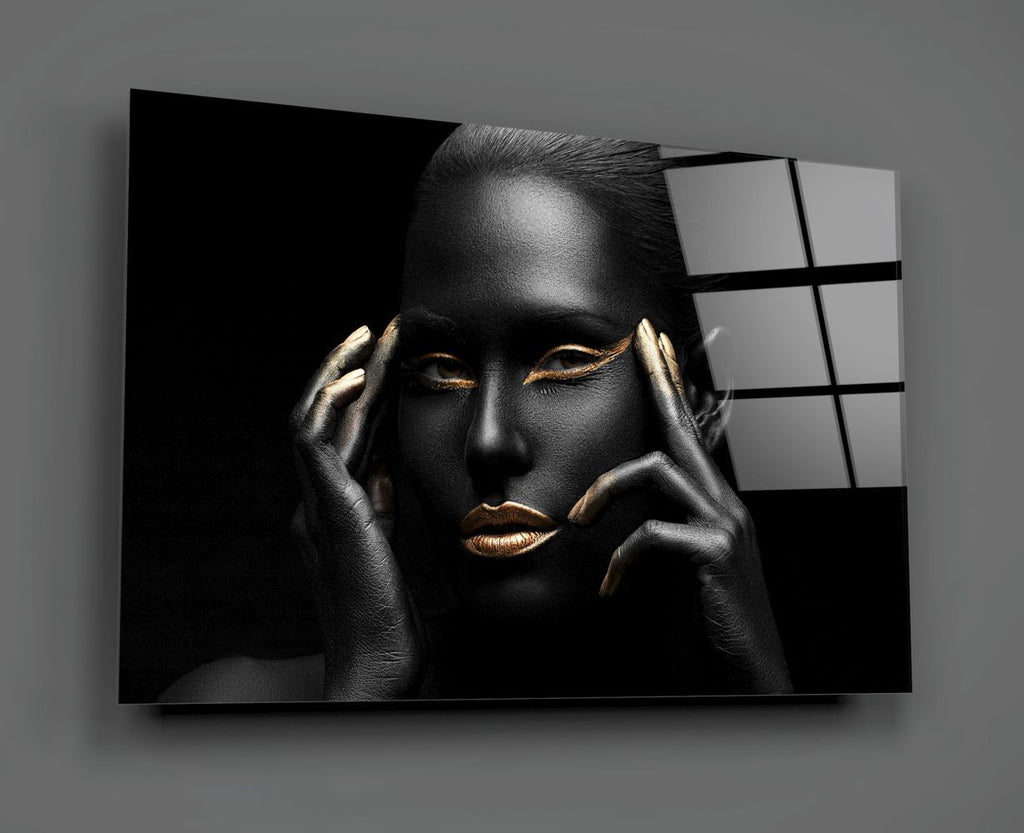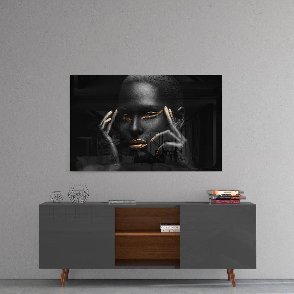 L'impression de l'Africaine maquillée et de face, est composée de doré sur les lèvres et les yeux. Elle regarde au loin, ses mains gracieuses sont posées sur son visage. L'ombre et la lumière se jouent sur son visage, tandis que l'arrière-plan noir donne vie aux tons sombres de sa peau. Présentant la beauté noire dans l'art, ce portrait féminin glamour met en valeur un teint lustré et des traits délicats du visage.
