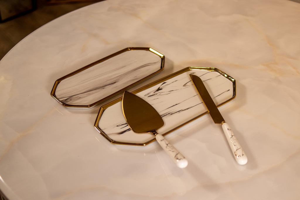 TREND HOME Lot de 2 assiettes à dessert marbré blanc avec liseré doré