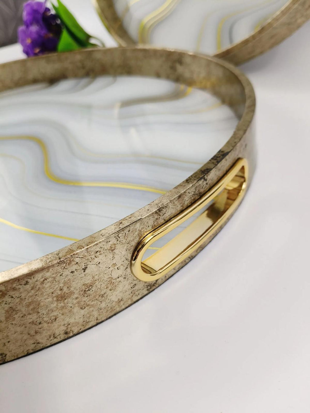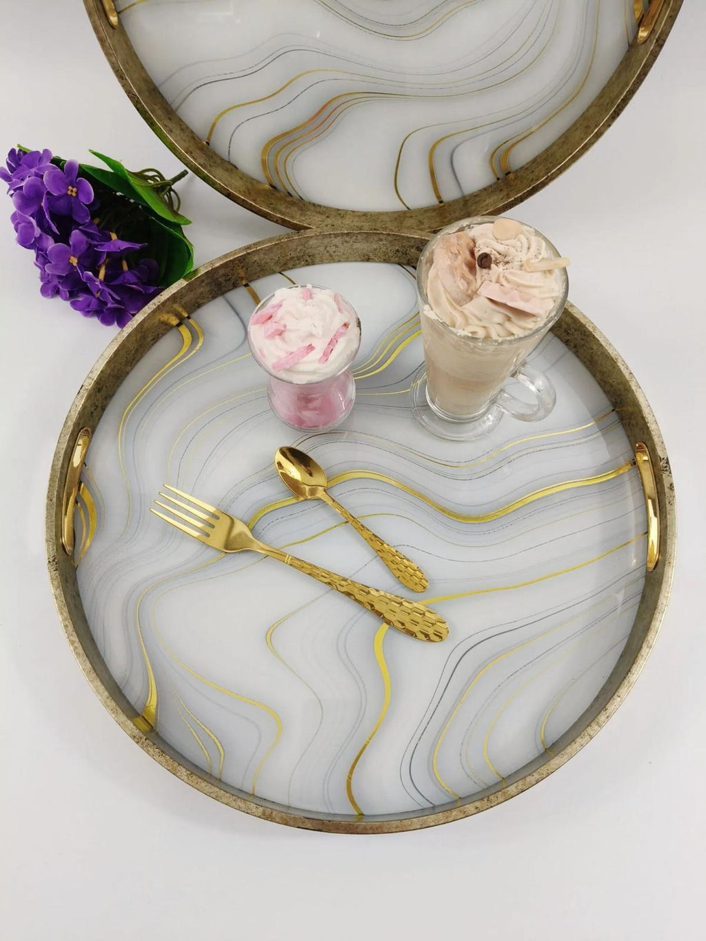 TREND HOME Lot de 2 plateaux blanc doré 40 et 35 cm