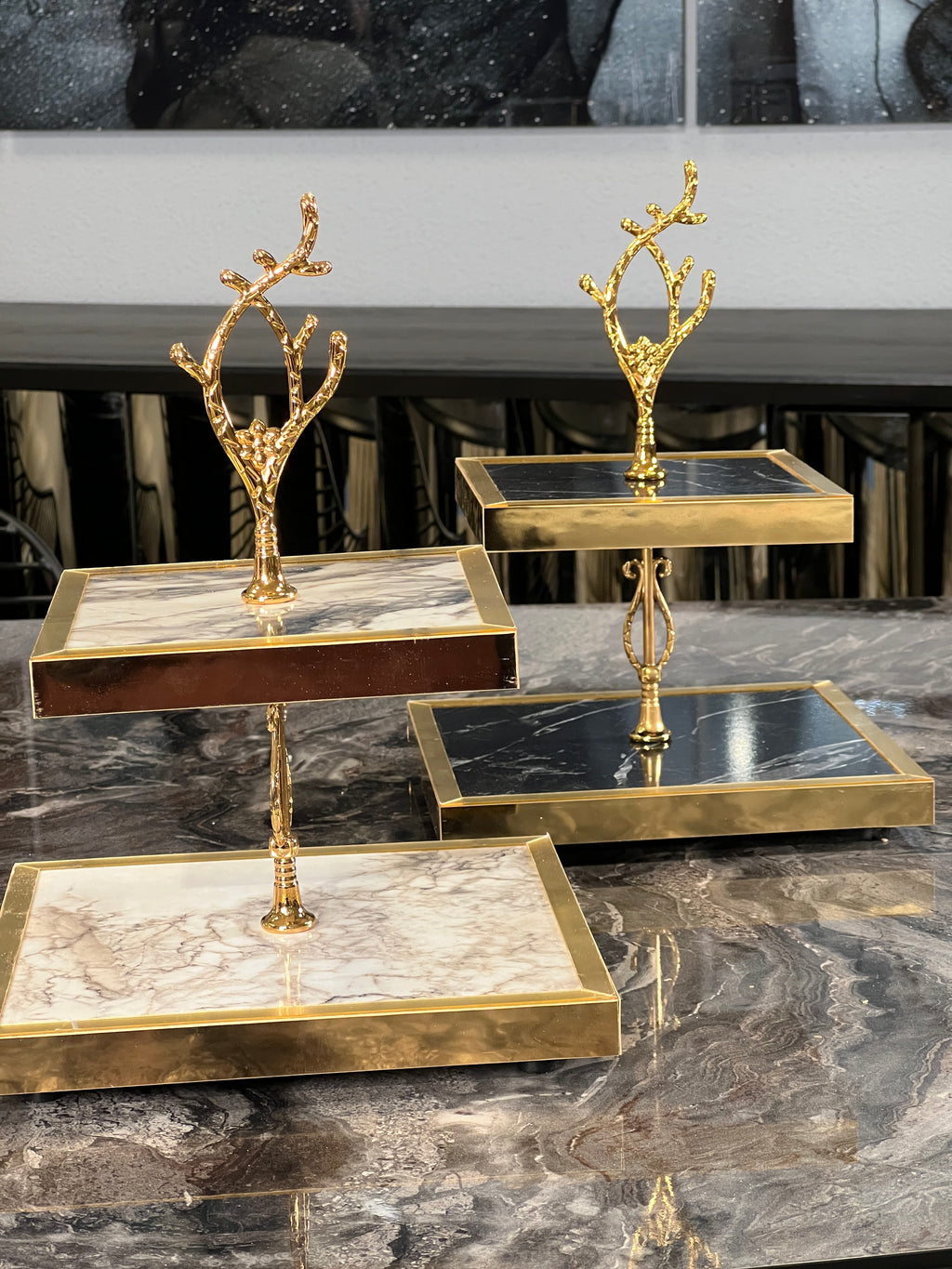 ZEYVE Présentoir à gâteau 2 étages motif marbré noir doré